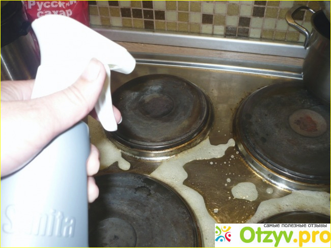 Способ применения спрея самый обычный. Несколько секунд встряхнула содержимое бутылки и нанесла на поверхность плиты. Запах не ароматный, но глаза не режет. Несколько минут оставила пену на плите, попыталась потереть губкой. Накипь не хотела оттираться.