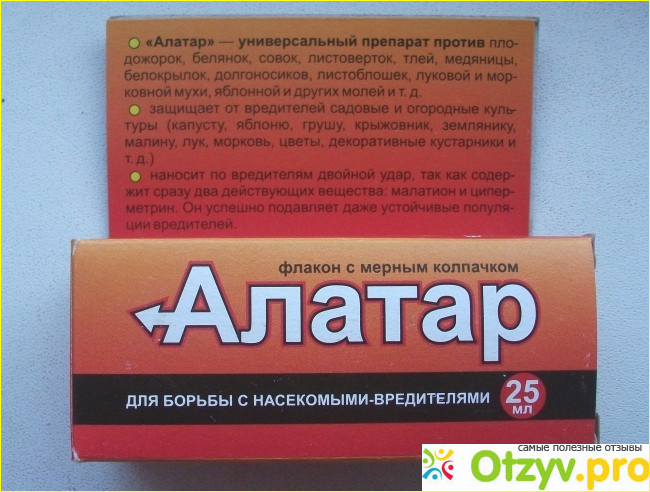 Дедовские методы, типа опудривания золой или опрыскивания отварами трав, если и действуют, то слабо и кратковременно. Вот и получается, что хочешь, не хочешь, а приходится к этой самой химии прибегать. Но при этом хорошо бы иметь средство, убивающее паразитов наповал, а для нас с вами абсолютно безвредное, чтобы надежно защищало растения на весь период роста, чтобы хватало однократной обработки, но полностью распадалось в собранном урожае.. Что то я размечтался. И Вам, если ждёте от меня названия такого чудо средства, я вынужден сообщить, что такого нет, и если оно будет создано когда-то, то это вряд ли произойдёт скоро. К тому же и насекомые не дремлют в этой войне. Учёные разрабатывают всё новые и новые яды для борьбы с ними, а они к ним приспосабливаются, так что эффективные вчера препараты сегодня на них уже не действуют. Выпускаемый Рязанским предприятием "Агрорус - Рязань" препарат Алатар, о котором сегодня пойдёт речь, конечно не панацея, но реально работающее средство, со своими достоинствами и недостатками, о которых у нас сегодня и пойдёт речь.