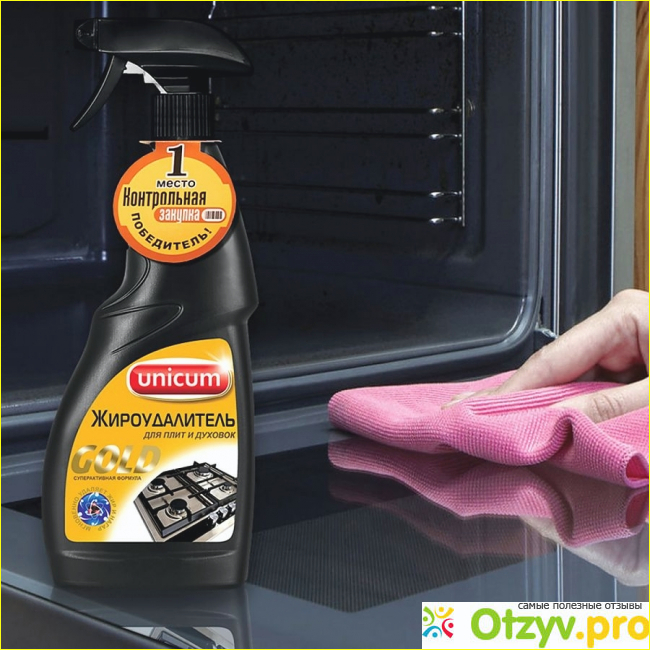 Еще одно отличное средство для чистки духовок и других поверхностей. Гель имеет густую консистенцию, превосходно справляется со всеми жирными посудами, противнями, духовкой, плитой, микроволновкой и вообще устраняет жир и копоть за считанные минуты.