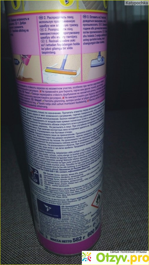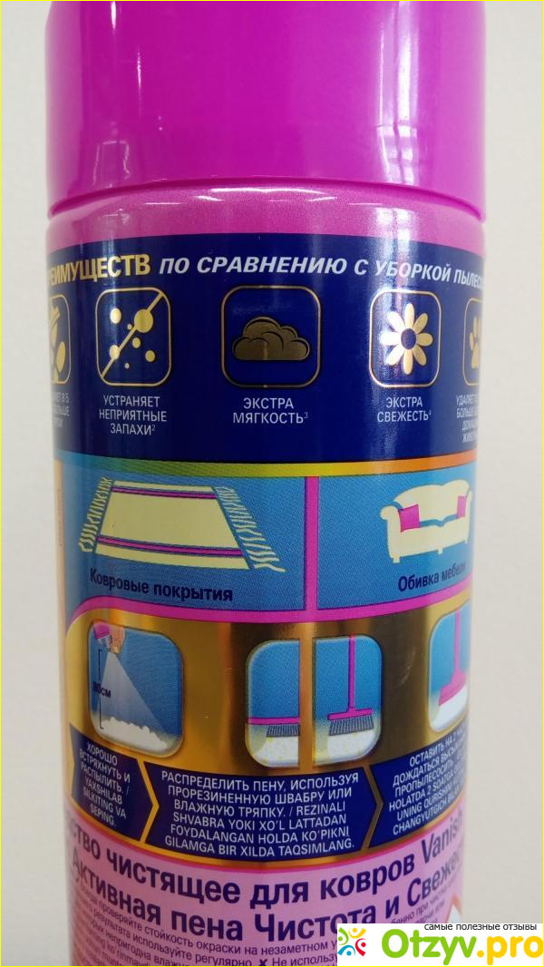 Средство для чистки ковра сделано в виде распылителя, его не надо как-то разводить или осуществлять другие подготовительные манипуляции, достаточно только распылить. Но все оказалось не так просто, пена при распылении разлетается в разные стороны, попадая не только на ковер, но и на близлежащие предметы и поверхности. А производитель указывал что "Пену легко наносить, она глубоко проникает в структуру ковра, эффективно удаляет грязь и пятна и оставляет после себя идеальную чистоту и запах свежести". Сделав, как указал производитель, я оставила это все на пару часов и придя через это время обнаружила, что в квартире стоит ужасных запах бытовой химии, от которого кажется аж ноздри залаживает, а производитель обещал запах свежести, но этот запах даже рядом или отдаленно не напоминает обещанный запах свежести. Пропылесосив все это я поняла, что запах никуда не делся, пришлось вытянуть на улицу- в квартире ребенок, как можно с такими ароматами "свежести" находиться ребенку. Ковер, с целью проветривания, несколько дней находился на улице, только на ночь заносился и оставался в свернутом виде. Даже спустя несколько дней, такого обширного проветривания, запах этого средства, доносящегося от ковра, все равно ощутим. Что касается результата чистки, то здесь также больших побед со стороны средства я не заметила, той обещанной чистоты "в пять раз чище" также нет. Стоимость баллончика составила 400 рублей, но в конечном итоге зря выброшенные деньги, при можно сказать, что нулевом эффекте.