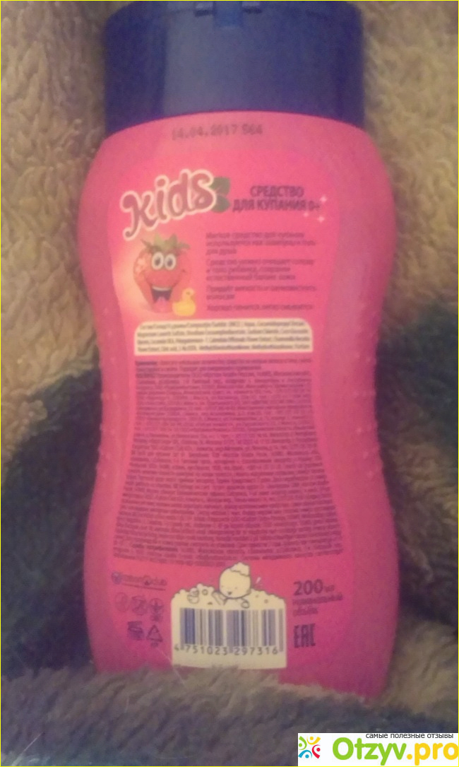 Рассмотрим внешний вид средства для купания: средство абсолютно прозрачное, то есть без красителей, достаточно жидкое по консистенции, имеет приятный аромат клубники, имеется парфюмированная отдушка.