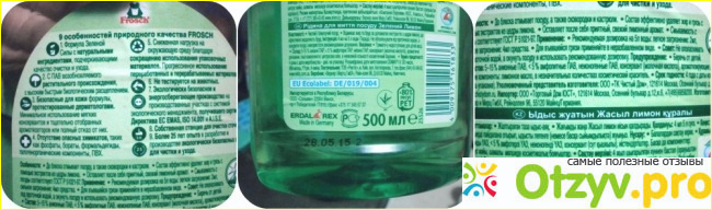 Пузатый флакон с прозрачным содержимым, упаковка полностью в зелёных тонах. Объём целых 500 мл. Изготовлено по Гост. На самой этикетке, которая приклеена на флаконе , содержится очень много информации об особенностях продукции фирмы " Frosch".