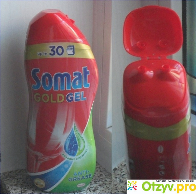 По сути внутри этой бутылки два разных средства, которые, видимо, не должны вступать в реакцию раньше того времени, когда окажутся в отсеке машины. Из одного отверстия вытекает синий гель, из другого - зеленый. Иногда попадается средство с красным гелем вместо зеленого.