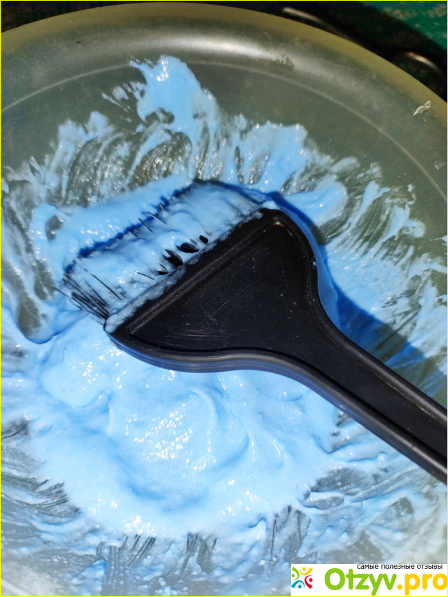 При смешивании она приобретает синий цвет. Размешивается без комочков, но вот проблема, даже на столь короткие волосы пачки хватила ровно на половину головы.