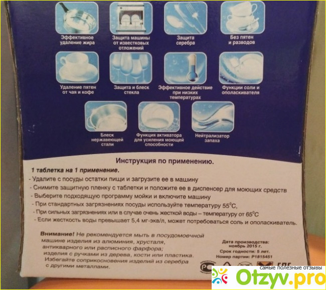 Средство продается в упаковках по 30 таблеток, которые закрыты защитной пленкой. Пленка эта не саморастворяющаяся в воде, ее надо снимать перед употреблением. Это на мой взгляд является минусом, поскольку не подобные препараты часто возникают аллергические реакции, а тут получается прямой контакт с кожей. Или же выходит, надевать перчатки ради этой процедуры, что тоже немного кажется абсурдным. Помимо таблеток коробка соджержала также еще и дополнительный бонус – очищающее средство для посудомоечных машин и стиралок на одно использование. Производитель в своей универсальности средства обещает хорошее отмывание посуды от жира, защита деталей машины от образования накипных отложений, отсутствие пятен и разводов, отсутствие агрессивного действия на серебряные изделия, очистка от пятен кофе и чая, устранение запахов, эффективная мойка в холодной воде и еще несколько приятных моментов – обо всех я сейчас сходу не могу вспомнить. В плане экологичности эти таблеточки не такие уж и безвредные, поскольку в них содержатся фосфатные соединения. Они хоть и отмывают грязь лучше, но с фосфатами уже давно борется весь мир, поскольку они загрязняют водоемы и ведут к их эвтрофикации. Какже получилось в реальном применении?