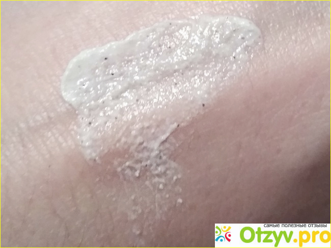 Получила, пахнет хорошо, в составе масло перечной мяты отвечает за этот момент. И оно представляет собой очень густой крем с какими-то мелкими частичками. По инструкции его нужно нанести на кожу, требующую размягчения, ну, где-то на минутку. А потом усиленно потереть. Я так и сделала. Потом, конечно же, смыть. Я так и сделала.