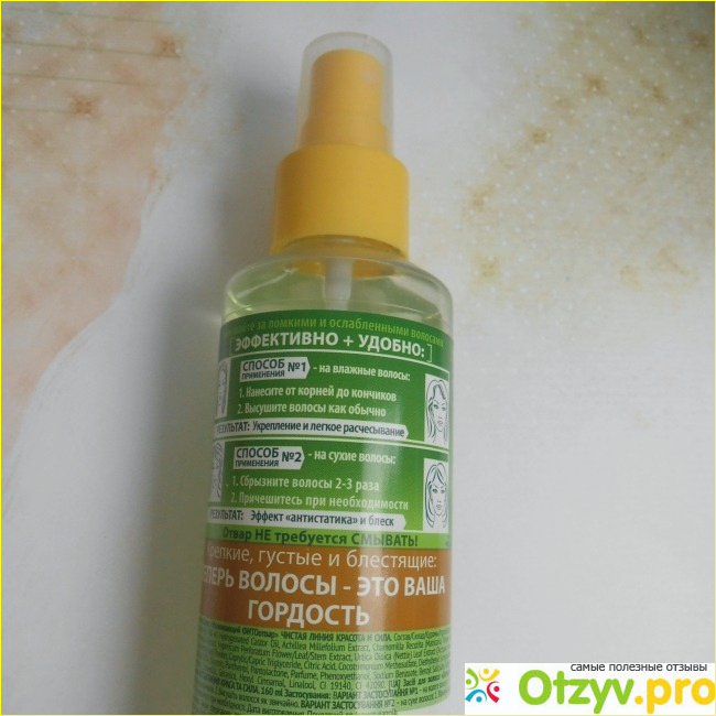 Иногда, например, во влажную погоду, когда мои волосы сильно пушатся и путаются, возникает необходимость распрямить сухие волосы. Раньше в таких случаях я пользовалась средством для укладки волос, а теперь -- этим Ухаживающим ФИТОотваром. Я просто распыляю его на волосы 2-3 нажатиями, а затем расчесываю обычной или электрической расческой. Чистая линия в таком случае еще и придает волосам антистатический эффект, а также блеск.