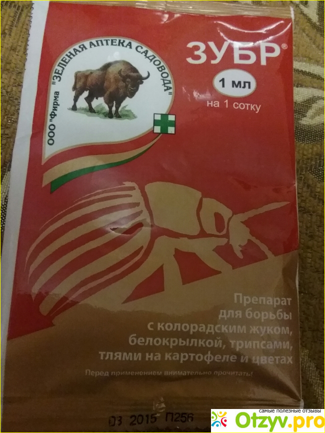 В настоящее время в продаже очень много инсектицидных средств от колорадского жука, которые помогают избавиться как от жука, так и от их личинок. Мы стараемся, чтобы у нас всегда в запасе были средства от вредителей, чтобы в любой момент можно было опрыснуть растения. В магазине "Сад и огород" муж приобрел препарат для борьбы с колорадским жуком под названием "Зубр", который продается в ампулах.