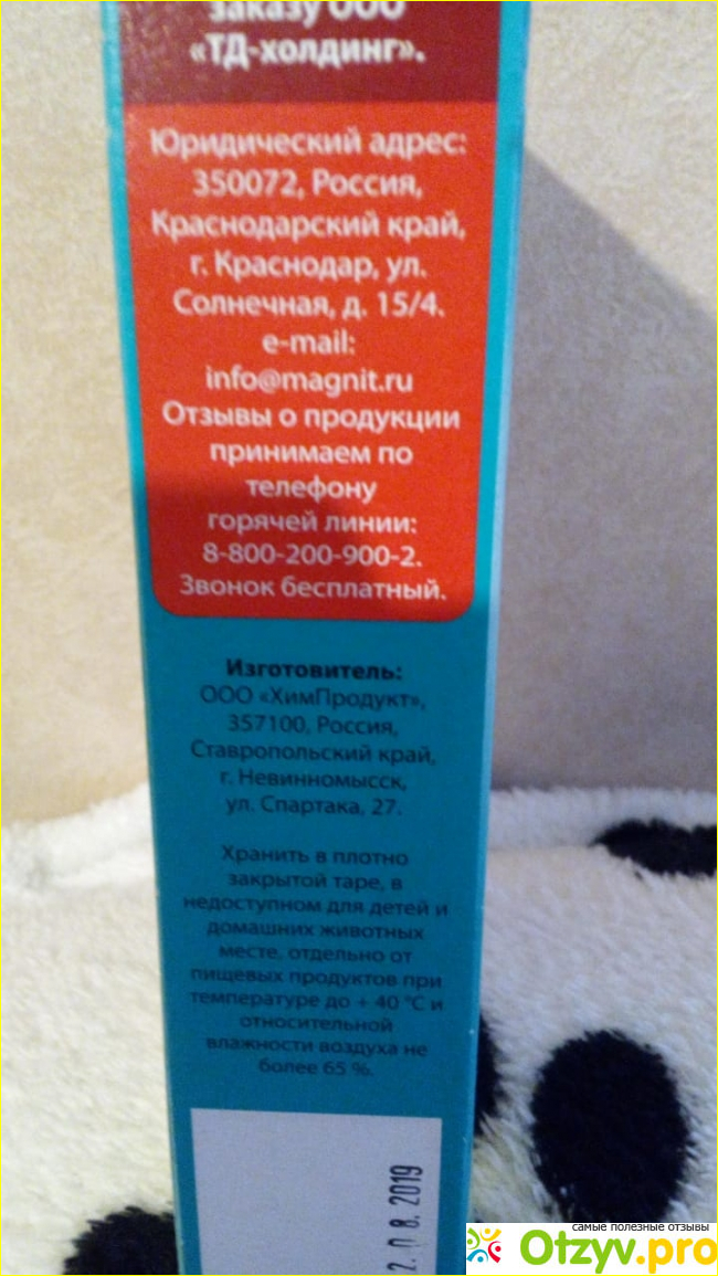 С боку упаковки можно прочитать названия и изготовителя, которого я уже выше упомянула и то, что средство это изготовлено по заказу ООО "ТД-холдинг", а также адрес его, e- mal, номер телефона горячей линии.