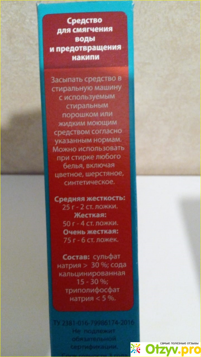 С другого бока упаковки информация о способе использования его — не забывать, что его засыпают вместе с порошком при стирке любого белья: белого, цветного, шерстяного и т. д. Срок годности 3 года.