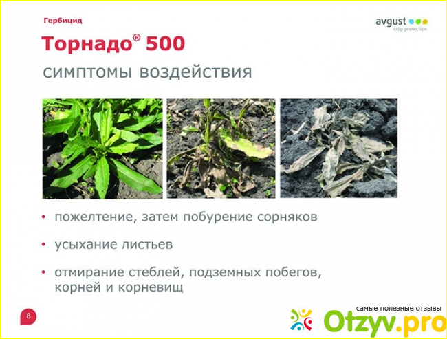 После обработки результат не заставляет себя ждать. Уже на третий лень растение начинает менять цвет. Оно становится салатового цвета, замедляется рост, затем буреет и постепенно начинает отмирать как надземная часть, так и подземная.
