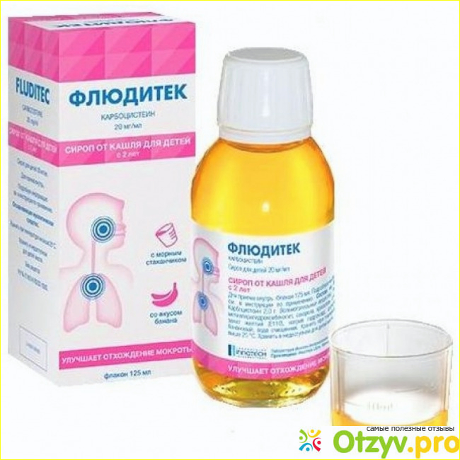 Сироп от кашля для детей "Флюдитек" с активным веществом муколитиком карбоцистеином - на мой взгляд очень эффективный при мокром кашле, когда мокрота плохо отходит и ребенок не может самостоятельно от нее избавиться.
