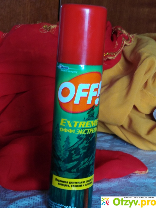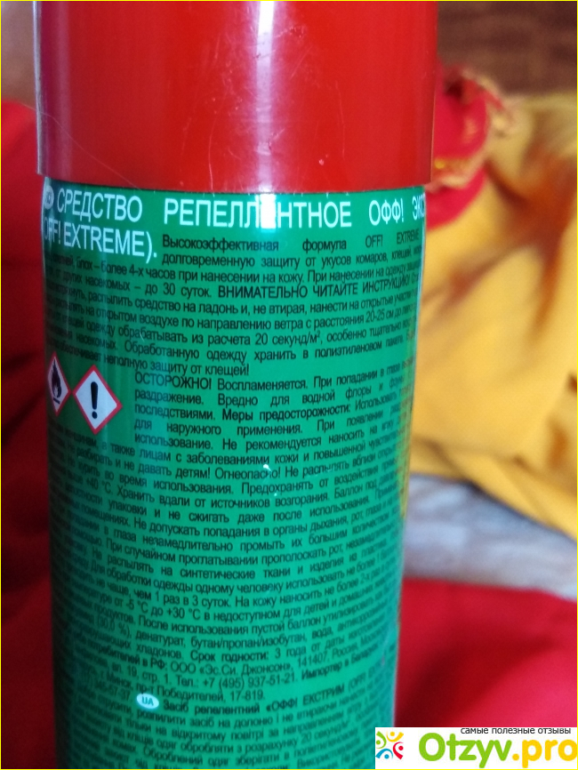 В поисках надёжного средства защиты от комаров и других кровожадных насекомых выбрала спрей OFF! Extrime. Баллончик объёмом 100 мл. Хватит на всё лето одному человеку. Производитель обещает долговременную защиту (до 4-х часов) от укусов комаров, слепней, мошек, москитов, блох, а также клещей, если нанести на одежду. Срок годности 3 года. В состав входит N-диэтилтолуамид -30%, спирт, отдушка, сжатый воздух под давлением. Данное средство сильнодействующее, имеет специфический запах, поэтому нужно соблюдать меры предосторожности: