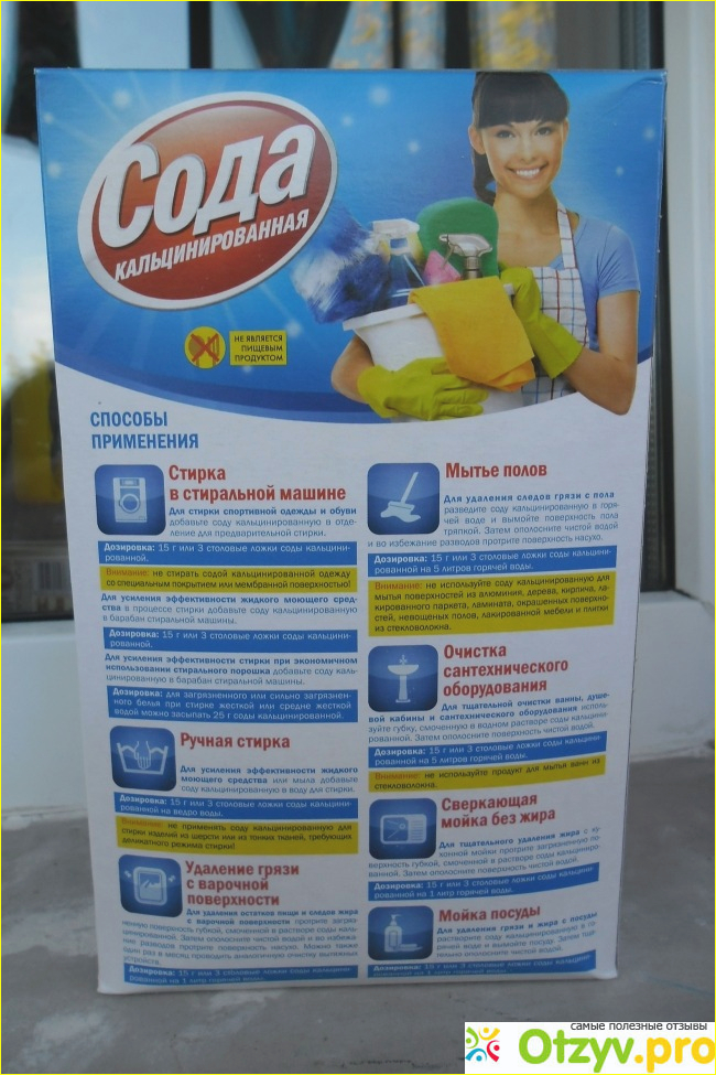 А вот на оборотной стороне пачки написано уже конкретно что можно мыть, как и сколько соды должно уходить на это все.
