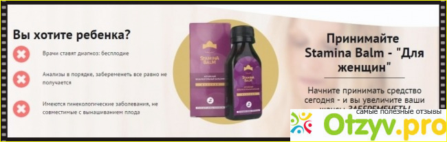 Stamina Balm женский бальзам заказывала себе почти год назад по совету гинеколога. Сегодня, находясь на пятом месяце беременности, благодарю только это чудесное средство. Я во втором браке и мы с мужем в течение четырех лет методично лечились и он и я.