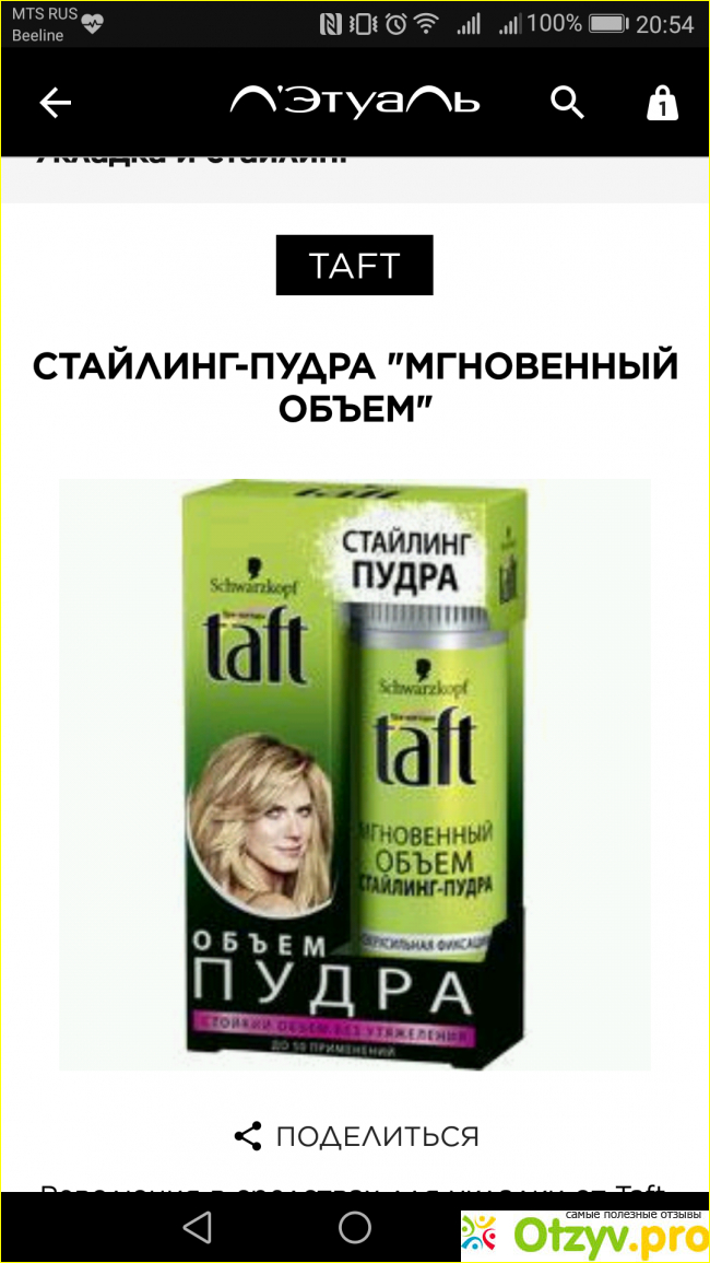 Купила стайлинг-пудру "Мгновенный объем" от Taft, впечатлившись симпатичной картинкой на упаковке и компактным элегантным флакончиком. Правда, особого эффекта я не ожидала, но его и не было. Пудра представляет собой белый порошок с довольно приятным запахом, но, во-первых, никакого эффекта объема, а уж тем более быстрой укладки он не дает, во-вторых склеивает и пачкает волосы, в-третьих, затрудняется и делает бессмысленным расчесывание.