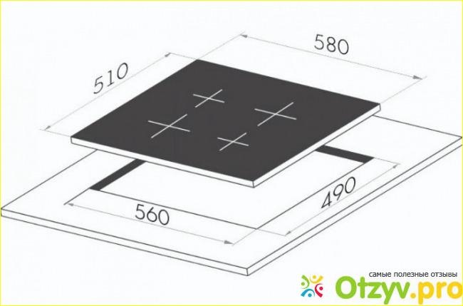 Размеры для встраивания таковы: пятьсот шестьдесят миллиметров - это ширина, и четыреста девяносто миллиметров - это глубина.