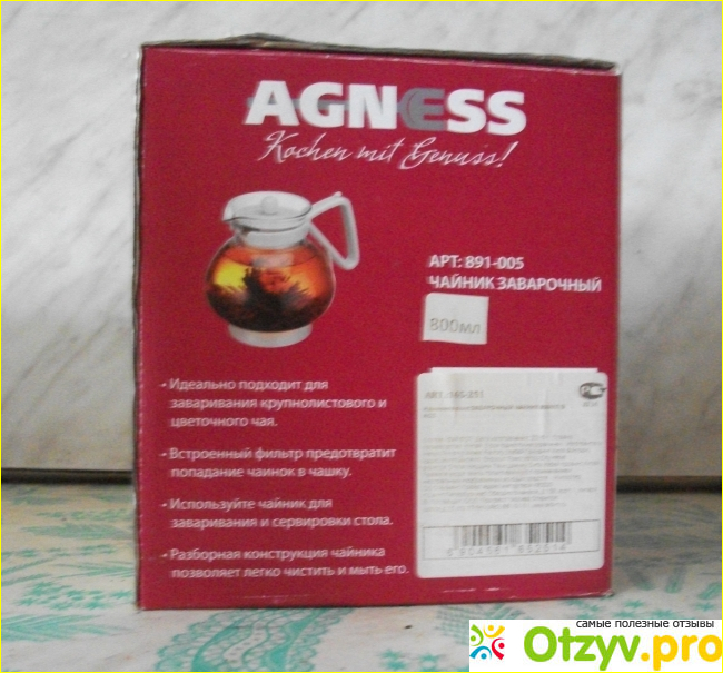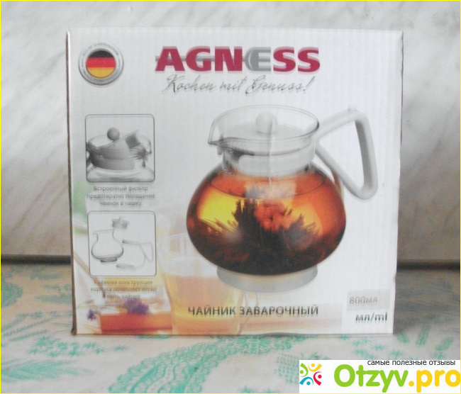 Чайник Agness имеет объем 800 мл. Этого вполне достаточно для семьи из 3 - 4 человек. Форма близка к шару. Ручка пластиковая, съемная. Это удобно с точки зрения безопасности, чтобы не обжечься и её легко снять когда нужно вымыть. Крышка надёжно удерживается внутри за счёт выступов на ней. На крышке имеется ситечко, задерживающее чаинки.