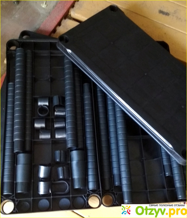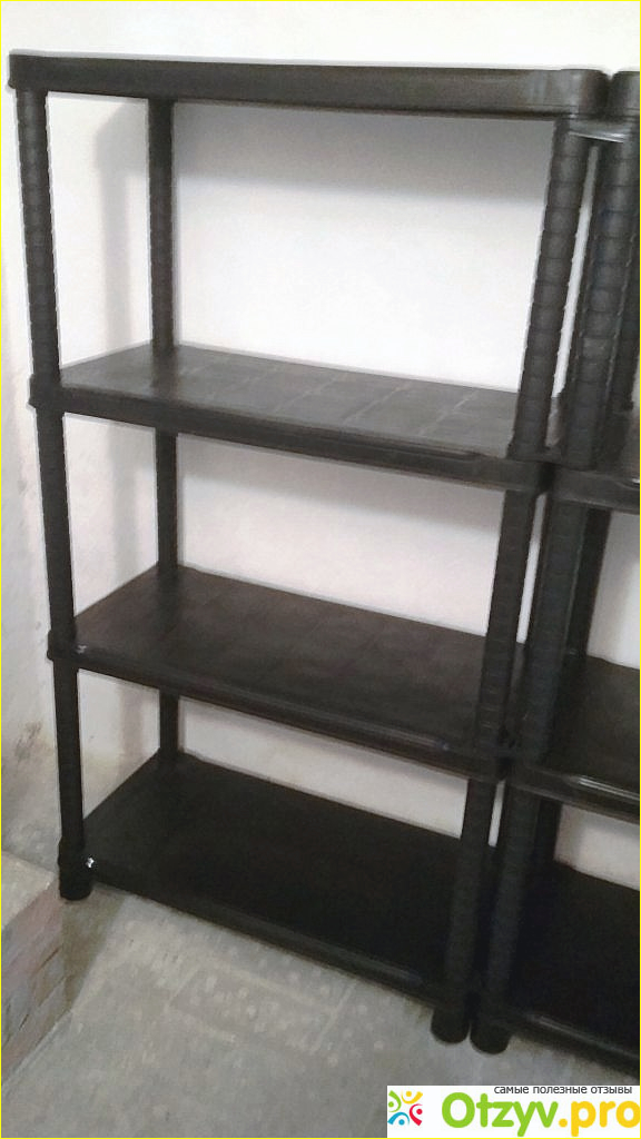 Как я уже говорил, данный стеллаж изготовлен из пластика. Пусть вас не берут сомнения, что данный стеллаж не выдержит большую нагрузку. Как заявляет производитель, максимальная нагрузка на каждую полку составляет 70 кг, а в целом он может выдержать до 280 кг. Это обеспечивается тем, что он изготовлен из прочного полипропилена, который устойчив к перепадам температуры, воздействию влаги и морозу.