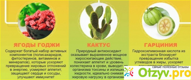 Кактус. Содержит вещества, воздействующие на центр насыщения, подавляя аппетит и вызывая чувство сытости. Также под его действием выводятся токсины, лишняя жидкость и избыточный холестерин из крови и сосудов.