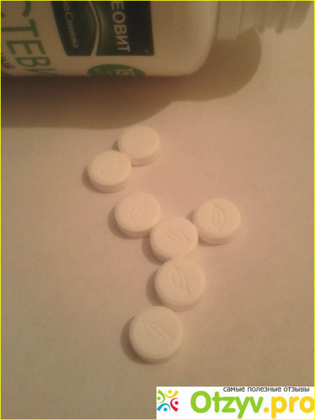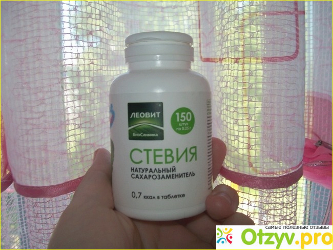 Стевия является натуральным продуктом, изготовлена в форме таблеток белого цвета, калорийность каждой всего 0,7 килокалории, вес 25 грамм и общее количество таблеток в упаковке 150 штук.