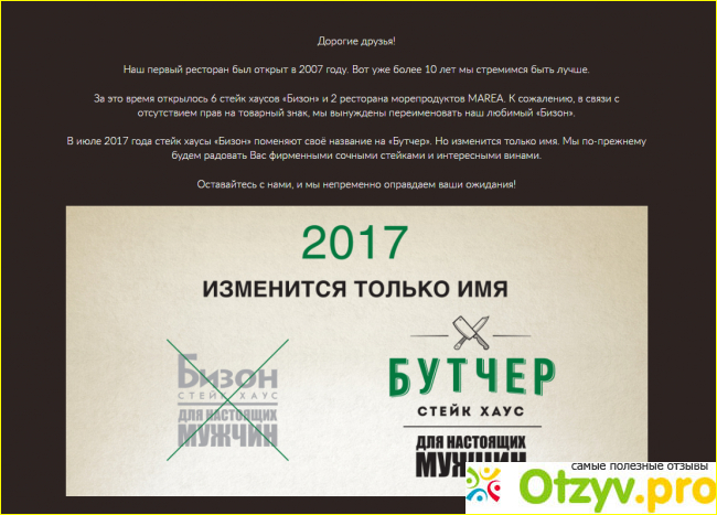 Важная информация: в 2017 году Бизон переименовался в Бутчер из-за отсутствия у руководства прав на товарный знак. Знайте это, потому что в интернете теперь вы не найдете Стейк хауса Бизон. Мы с супругом сначала тоже удивились, когда не увидели в сети привычного Бизона, зато на первых страницах выдавался Бутчер. Хорошо, что я догадалась по фотографиям, что это одно и тоже. После я зашла на сайт butchersteak.ru, где информация о переименовании ресторана подтвердилась официально.