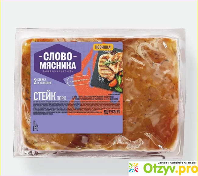 Эти стейки - замаринованные кусочки свинины, мясистые, с минимальными прослойками сала. Прозрачная вакуумная упаковка, внутри два подготовленных для жарки на сковороде или гриле кусочка свинины.