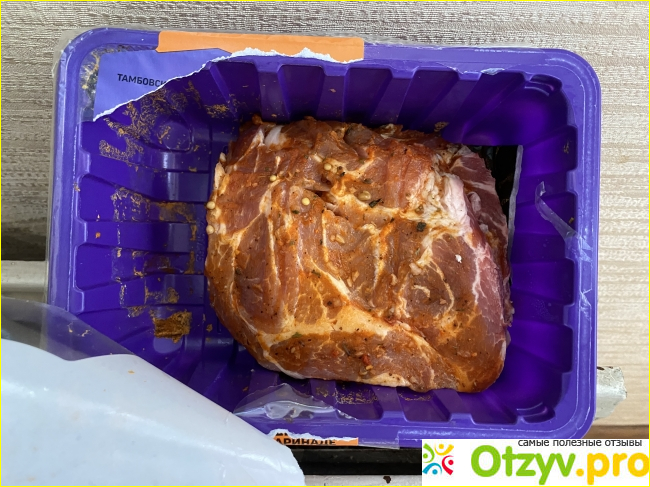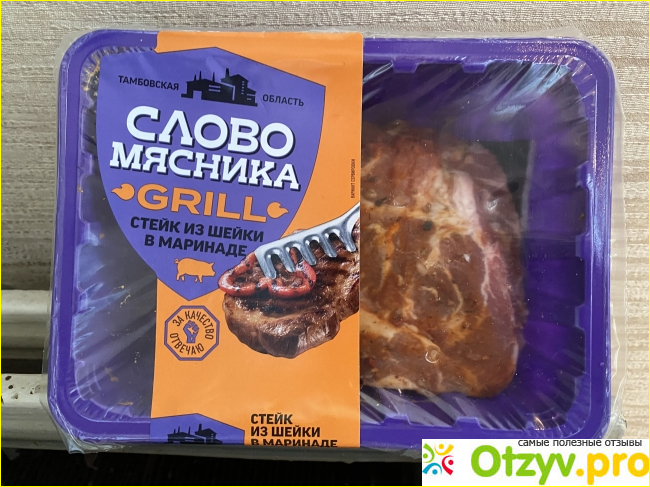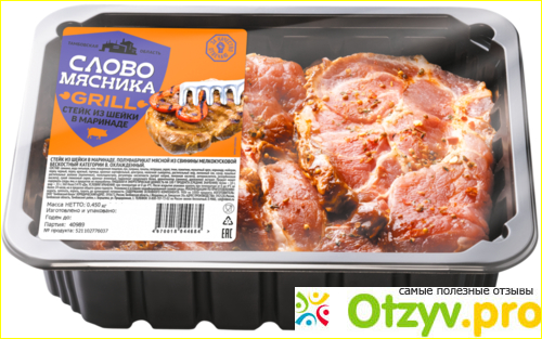 По срокам стейки были очень свежие. Одна такая упаковка обошлась мене в 300 рублей. Ну для качественного продукта денег не жалко. Рассказываю, какое впечатление от стейка. Итак, внутри упаковки стейк из свиной шейки в маринаде.