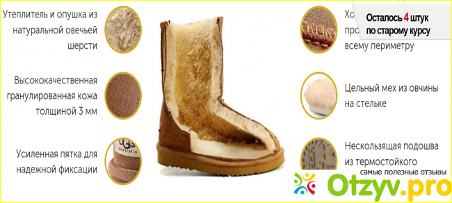 Ольга: «Некогда было бегать по магазинам, решилась первый раз заказать обувь по Интернету. Цена за угги была уж больно привлекательной. Теперь хожу и хватаюсь. Сапожки восхитительные: теплые, удобные настоящие. Планирую еще заказать такие высокие и в другом цвете. Благо на сайте зафиксировали цены и продают обувку по старому курсу».