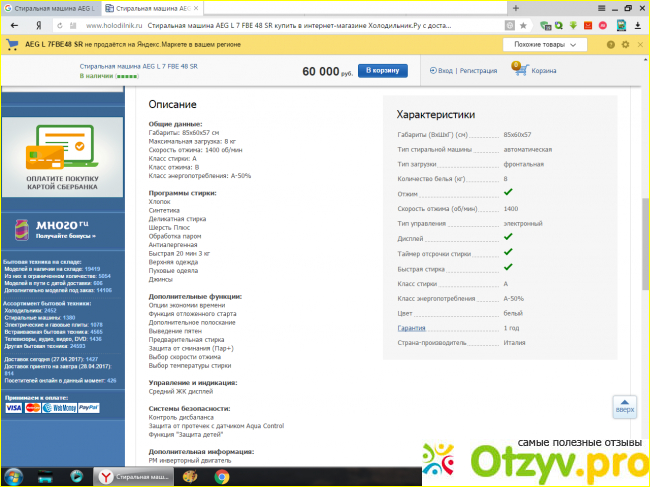 У моей мамы уже не первый год работает стиральная машина AEG L 7 FBE 48 SR и она от нее просто в восторге, ни одного косяка за ней не было замечено, работает и не ломается. Мы так же решили купить такую же модель. Очень не бюджетный вариант, но сразу же скажу, что такая ценовая категория здесь по той причине, что много функций, качественная сборка, а так же еще она работает без шума. Покупали ее год назад с гарантией на обслуживание за 60000 рублей, очень дорого, но все же деньги она свои оправдала и не раз.