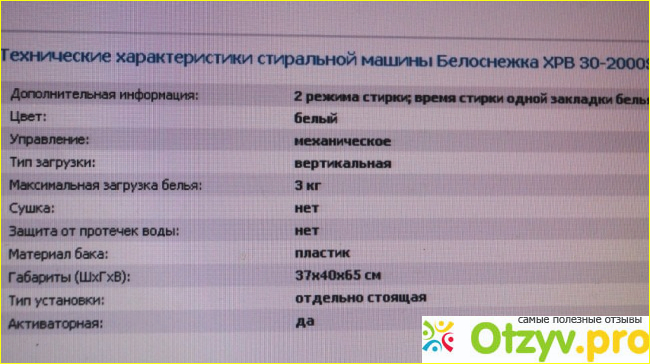 В целом мы очень довольны, что для этих своих целей приобрели именно эту полуавтоматическую стиральную машину «БелоснежкаХРВ 30-2000 S». Она у нас, как палочка выручалочка, да и обижаться на неё просто грех. Примечание: высота машинки – 65 см, ширина – 39,5 см, загрузка белья вертикальная с массой 3 кг сухого белья, в данной модели предусмотрено 4 режима стирки, нужный вам режим набирается при помощи поворотного переключателя, в качестве моющего средства можно использовать порошок любого типа, «стиралка» на капризная.