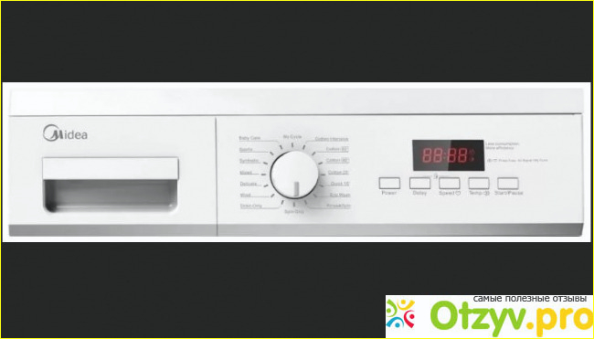 Стиральная машина Midea ABWM 612 G2 Glory 02 снабжена небольшим дисплеем, на котором отображается процесс стирки и все режимы стирки.