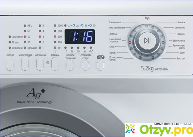 Из особенностей стиральной машины Samsung WF7452SUV я могу выделить следующее: полностью хромированное покрытие люка, работа по технологии Silver Nano, нагреватель с керамическим покрытием, присутствует индикаторы неисправностей, а также имеется моющий фильтр и защита от перегрева. Коль мы заговорили про безопасность, то здесь еще надо отметить наличие блокировки дверцы и защиты от детей, контроль дисбаланса, контроль уровня пены, защита от протечек по корпусу.