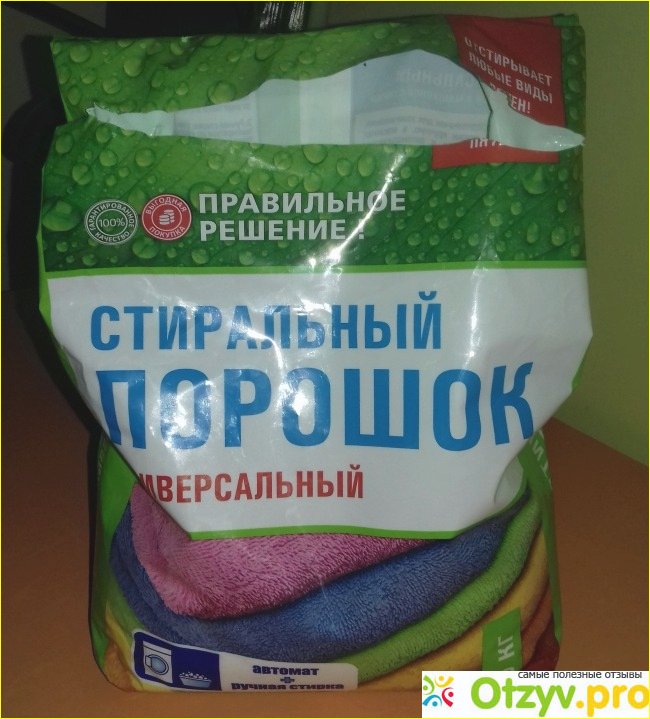 Данный стиральный порошок, от марки "Правильное решение" не имеет каких-либо красивых названий - он просто называется универсальным стиральным порошком. Но вот дизайн у него еще не самый простой, а довольно-таки яркий, привлекательный.