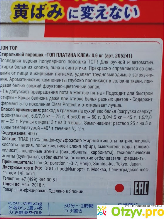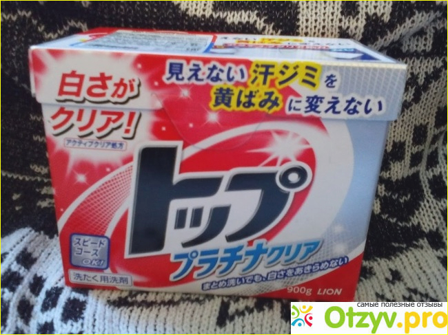 Вся пачка усыпана японскими иероглифами, и вряд ли удалось бы понять, что из себя представляет порошок, что им можно стирать и т. д., если бы магазин заботливо не приклеил наклейку на русском языке с полным описанием этого японского "чуда".