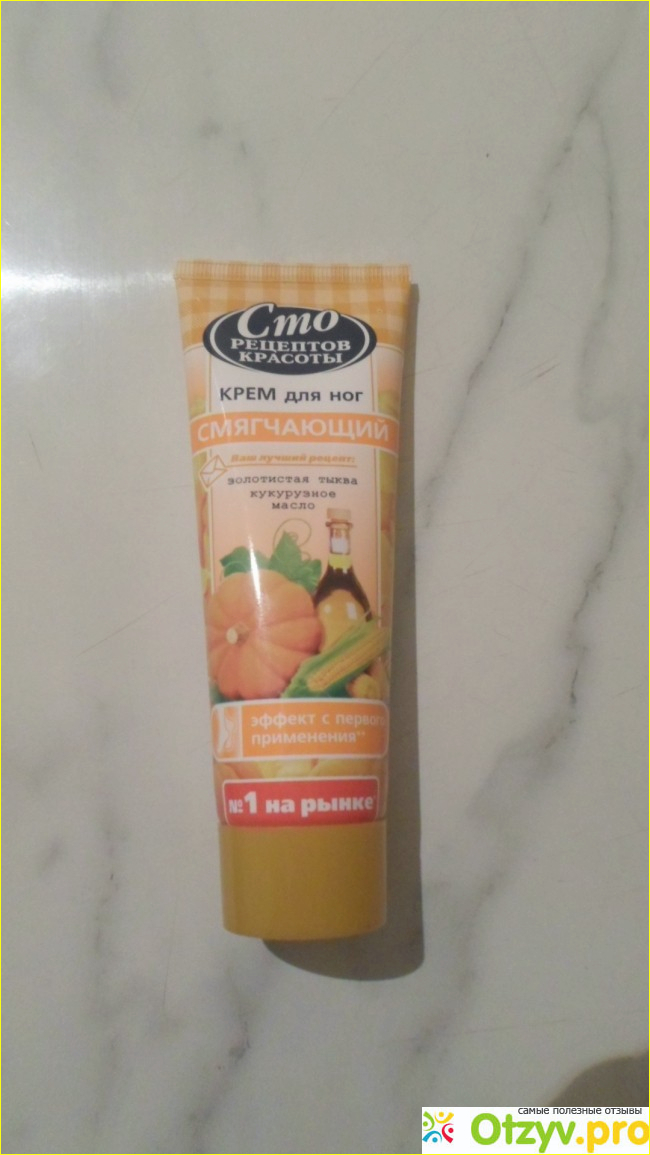 Очень хорошо обладает свойствами предотвращая сухость и шелушение. Сразу чувствуется как повреждённая треснувшая и пересушенная кожа просто восстанавливается становится нежной мягкой и на пятках очень гладкой. Мои ноги увлажнённые и освежённые просто дышат отдыхают от неприятностей. Это удивительное восстанавливающее и увлажняющее косметическое средство - чудо крем теперь постоянно рядом в голове на постели, что бы не забывать вовремя обрабатывать ступни моих ног. Расфасован крем для ног сто рецептов красоты "Золотистая тыква и кукурузное масло" в пластиковый мягкий тюбик объёмом 80 мл. Изготовитель: ООО "Концерн Калина", Россия, г. Екатеринбург.