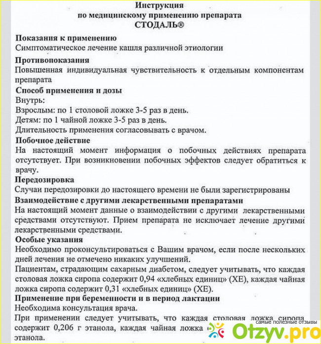 Фармацевт мне посоветовала сироп Стодаль. Сказала что в моём положении этот сироп будет для меня или ребёнка безопасным. Этот сироп даже назначают детям, просто в небольших дозах. Я купила этот сироп, я знакомилась инструкция по применению. Расскажи немного о самом сиропе от кашля Стодаль. Это сироп который имеет приятный карамельный вкус. Наверное поэтому его легко давать детям, ведь он такой вкусный. По инструкции принимать необходимо был вам по 15 мл. Для этого в этом сиропе есть удобный мерный колпачок. В инструкции говорилось, что при беременности нужно было проконсультироваться с врачом. Наверное, я пренебрегла этим советом и на свой страх и риск стала принимать этот сироп. Меня успокаивало то, что у него практически не было противопоказаний. Единственное, что я нашла в инструкции, что с осторожностью его нужно было принимать людям, Которые страдают сахарным диабетом. Потому как вы там сиропе Содержатся некоторые компоненты, которые в больших количествах могут быть опасны для людей с таким заболеванием.
