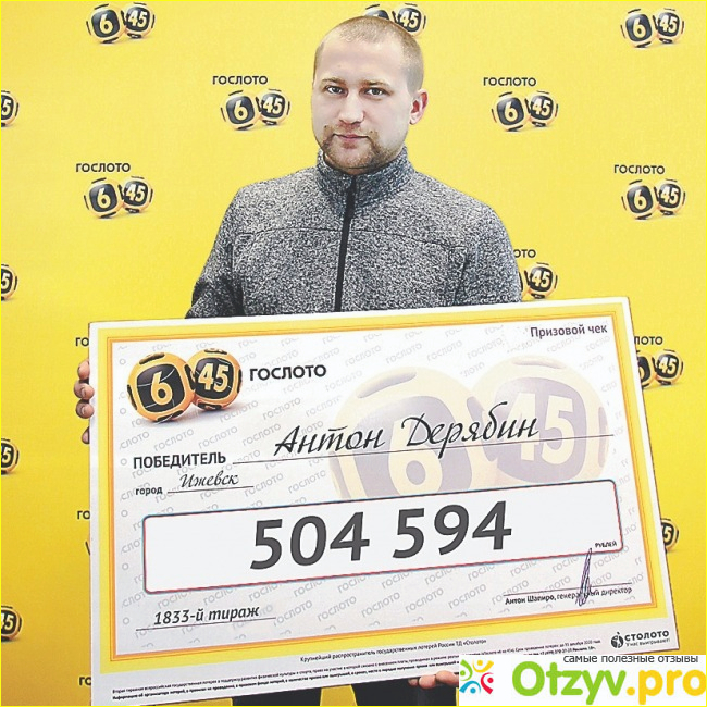Сергей . 34 года . Москва. Сидел как то в интернете, лазил, что то искал и случайно переходя оказался на сайте "Столото". Хотел уже уйти , но смотрю всё знакомо, многие розыгрыши попадались по телеку, задержался, начал изучать. И что то так потянуло сыграть, даже сам от себя не ожидал. Выбрал лотерею что была самой близкой по временным рамкам. А что бы не вкладываться много сыграл в Гослото 7 из 49. В общем после регистрации внёс деньги за билет и надо было ожидать следующего дня. Ну надо подождём, день не неделя :). А на следующий день занимаюсь своими делами и уже чуток подзабыл что купил билет, и тут приходит смс, что вы выиграли. Я захожу на сайт и я оказался среди 71 счастливчика которые выиграли по 390 рублю. Так что я взял ещё пару билетов "Русского лото" остальные вывел на Яндекс-деньги, берут конечно проценты, ну и хоть так. Так что по закономерности судьбы, вы можете всю жизнь играть и не выиграть крупную сумму, а можете раз в жизни купить билет и сорвать куш. Я кстати с тех двух билетов ничего не выиграл, так что думаю всё ещё, поиграть или нет.