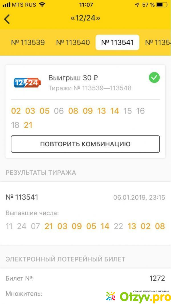 Думаете я остановилась? НЕТ! Придя домой, в этот же вечер решила ещё раз испытать свою судьбу и купила через мобильное приложение (на покупку оно работает великолепно) два лотерейных билета двенадцать из двадцати четырех, которые стоили с учетом пятидесяти процентной скидки тридцать рублей каждый. Опять удача! Сумма выигрыша по каждому билету составила тридцать рублей - итого: шестьдесят рублей прибыли. Деньги вывела на свой электронный кошелек.