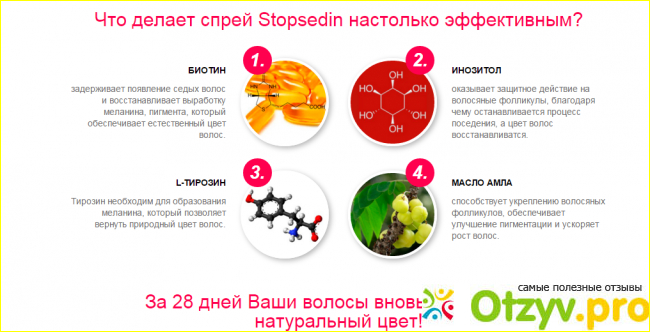 Так, что же из себя представляет Стопседин? Средство это разработано сравнительно недавно и за две три недели использования гарантирует результат. В его состав входят только натуральные компоненты (биотин, инозитол, тирозин, масло амлы), тестирование показало, что препарат является абсолютно безвредным, более того данное средство благотворно влияет на структуру волос, укрепляет повреждённые, ломкие волосы и восстанавливает их натуральный цвет, останавливая выработку меланина.