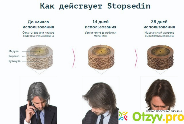 Как уже упоминалось выше, стопседин представляет собой спрей, созданный на натуральной основе, который борется с сединой благодаря своему принципу действия. Препарат стимулирует и поддерживает природный процесс пигментации, предотвращая обесцвечивания волоса, проникает в сам волосяной фолликул.