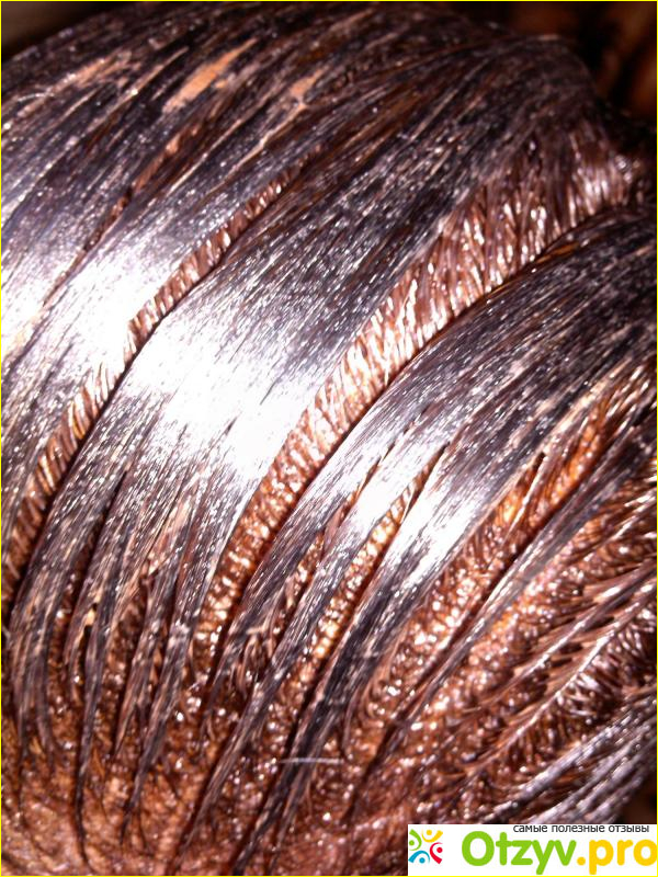 Краску смешивать с окислителем нужно в неметаллической посуде. Вот так волосы выглядят во время окрашивания.