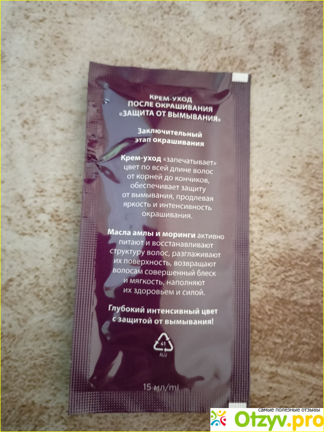Пакетик с крем - уходом 15 мл использую после окрашивания, имеет приятный легкий аромат.