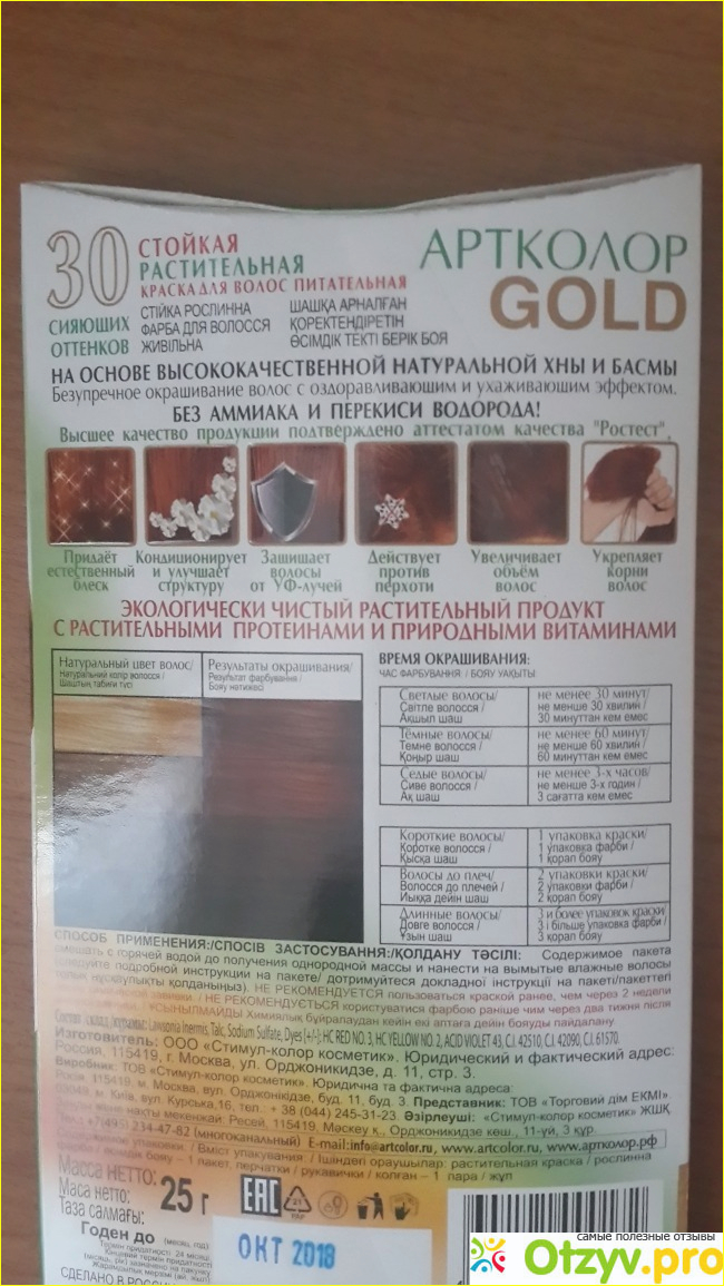 Состав у краски неплохой. К сожалению, нигде не указано в каких пропорциях нужно смешивать краску с водой, написано только до получения однородной массы, также не указано, какой должна быть эта масса, жидкой или густой. Также не указано, сколько времени нужно держать краску на волосах, написано просто: после завершении процедуры окрашивания промыть волосы водой.