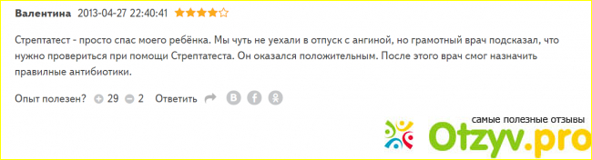 О данном тесте много положительный отзывом, особенно от родителей. Именно такой экспресс тест очень удобен в применении для деток. Но перед применением обязательно ознакомьтесь с инструкцией по применению этого теста. И тогда Вы не заметите сложностей. Как же пользоваться таким экспресс стремитесь?))В начале нужно взять четыре капли из красного флакона, четыре из желтого, потом взять мазок с миндалем и задний стенки горла, желательно не дотрагиваться стерильной палочкой ни до языка, ни до зубов и так далее. Прокрутить палочку в пробирке десять раз и оставить в пробирке на одну минуту, далее выжать ватную палочку в раствор, далее опустить тест полоску стрелкою вниз в раствор и подождать пять минут. Так, что как видите он очень прост в использовании. Мой отзыв о данном препарате будет только положительный. Думаю мой отзыв будет вам полезен при выборе для себя и своей семьи быстрого, надежного, точного экспресс теста, как стрептатест. Купить его можно в аптеках и лабораториях, средняя стоимость за пять тестов одна тысяча рублей.