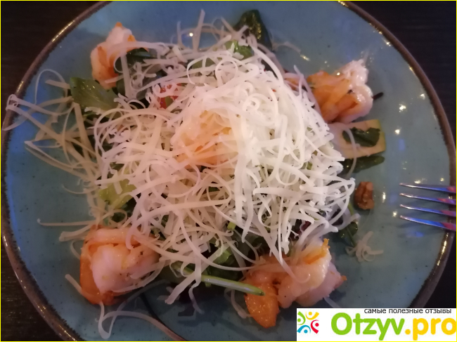 Качество блюд на твердую четверку, до пятерки немного не дотягивает. К ингредиентам и вкусу претензий нет, просто нет баланса. Например, в салате с креветками много сыра. Для кого - то это плюс, но мне кажется можно было поменьше его добавить (это второстепенный ингредиент) и использовать сыр, который мелко натерли.