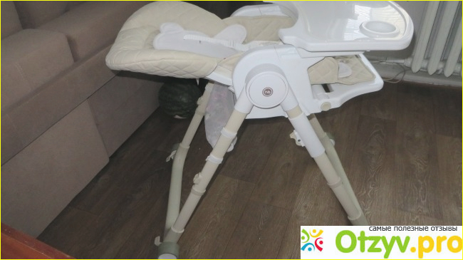 Это очень удобно, т. к. если поднять подножку, то в стульчик ребенка можно просто положить поспать, или как я присаживала его, чтобы не оставлять на диване или на полу . Также сиденье стульчика регулируется по высоте в семь положений. Пока ребенок маленький и мы кормим его с ложечки, то сейчас у нас стул расположен на максимальной высоте. Когда подрастет опустим вниз, чтобы сам садился и занимался своими делами.