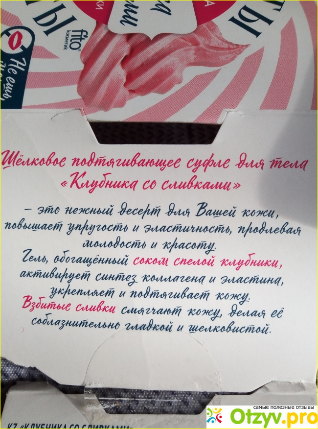 Шёлковое подтягивающее суфле, с соком клубники и взбитыми сливками, как указывает производитель. Производитель, кстати, отечественный, находится в городе Раменское, Московской области, ООО "фитокосметик". На упаковке все данные производителя, адрес, контакты.