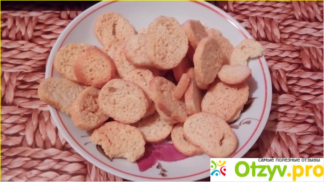 Сухарики овальной формы, ровные, в меру тонкие. Порадовало, что не много битых и потресканных кусочков на дне. Внешне светленькие, золотистые. Вот такие: