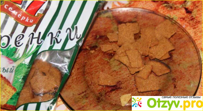 От других аналогичных сухариков, которых я пробовала, сухарики "Три семерки" отличаются хрустящим вкусом. Ведь бывают такие гренки, которые я купила раз и отказалась от них: бывают очень жесткий и толстые - непонятно как их грызть.